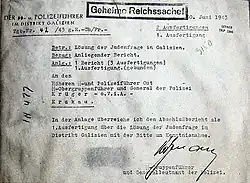 „In der Zwischenzeit wurde die weitere Aussiedlung energisch betrieben, sodass mit Wirkung vom 23. Juni 1943 sämtliche Judenwohnbezirke aufgelöst werden konnten. Der Distrikt Galizien ist damit, bis auf die Juden, die sich unter der Kontrolle des SS- und Polizeiführers in Lagern befinden, judenfrei .