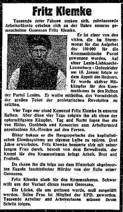 - ↑ Die Beisetzung des Arbeiters Klemke. In: Vorwärts, 26. Januar 1932; fes.imageware.de