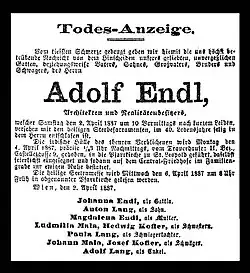 - ↑ Adolf Endls Parte unter anderem in: Neue Freie Presse, 3. April 1887, Seite 13.