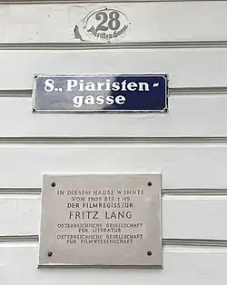 An Fritz Langs Elternhaus, Zeltgasse 1 (zugleich Piaristengasse 28 und Neudeggergasse 23) im achten Bezirk, wo er abgesehen von seinen Münchner (1912/13–1913/14)[11][12] und Pariser Studienaufenthalten (Sommer 1913,[13] 1914) sowie seines Kriegsdienstes (1915–1918) von 1900 bis zu seiner Mitte September 1918 erfolgten Übersiedlung nach Berlin wohnte, ist seit 1979 eine inhaltlich fehlerhafte Gedenktafel[1] angebracht, was der Fritz-Lang-Experte und Lang-Vertraute Cornelius Schnauber bereits 1986 bedauert hat: „Die Fritz–Lang–Gedenktafel am Wohnhaus in der Piaristengasse in Wien enthält leider falsche Daten.“[14]