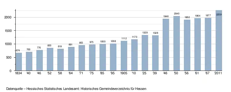 - ↑ a b Ausgewählte Daten über Bevölkerung und Haushalte am 9. Mai 2011 in den hessischen Gemeinden und Gemeindeteilen. (PDF; 1,8 MB) In: Zensus 2011. Hessisches Statistisches Landesamt, S. 28 und 66, archiviert vom (nicht mehr online verfügbar) am 27. Oktober 2020.