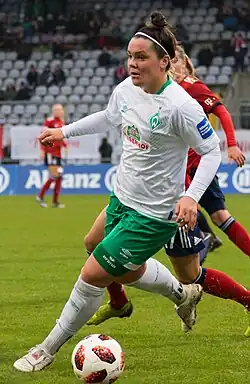 Erfolgreichster Verein aus Werther ist der am 27. Mai 1920 gegründete BV Werther. Die Vereinsgründer waren ehemalige Schlagball- bzw. Faustballspieler des TV Werther.[51] Die Mannschaft spielte von 1959 bis 1965, von 1970 bis 1982 und von 2012 bis 2017 in der Bezirksliga. Größter Erfolg war die Vizemeisterschaft hinter der TSG Harsewinkel in der Saison 1970/71.[52] Die Frauenmannschaft spielt seit 2011 in der Landesliga und erreichte im Jahre 2024 das Halbfinale im Westfalenpokal. Dort unterlag die Mannschaft der DJK Wacker Mecklenbeck mit 0:5.[53] Die Heimspiele werden auf der Sportanlage Meyerfeld ausgetragen. Der Verein brachte mit Andreas Triebel einen späteren Regionalligaspieler und mit Aytürk Geçim einen deutschen Futsal-Nationalspieler hervor. Umgekehrt war die ehemalige Bundesligaspielerin Deniz Harbert beim BV Werther aktiv. Erich Staude und Willi Haubrock wirkten als Trainer beim BV Werther.