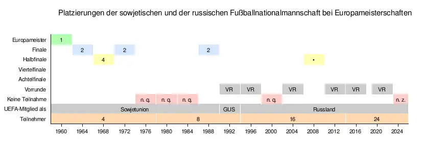 Der Artikel beinhaltet eine ausführliche Darstellung der Fußballnationalmannschaft der UdSSR die von 1959 bis 1988 für die Sowjetunion und 1992 für die Gemeinschaft unabhängiger Staaten bei Europameisterschaften bzw. den Qualifikationen dazu antrat. Die UdSSR konnte sich sechsmal für die Endrunde der Europameisterschaft qualifizieren, erreichte viermal das Finale und konnte es aber nur beim ersten Mal gewinnen. Nach der Aufspaltung der Sowjetunion in mehrere unabhängige Staaten trat die russische Nationalmannschaft ihre Nachfolge an und nahm erstmals 1996 an der Qualifikation teil, wo sie sich auf Anhieb qualifizieren konnte. Die Erfolge der Mannschaft der UdSSR werden von der UEFA nun Russland zugerechnet.