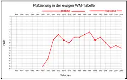 | 31 WM-Spiele 15 Siege 6 Unentschieden 10 Niederlagen 53:34 Tore | |