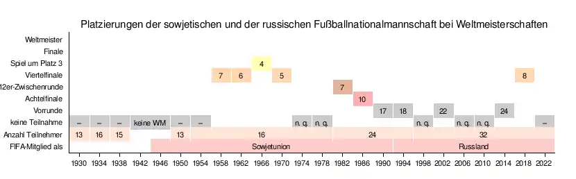 Der Artikel beinhaltet eine ausführliche Darstellung der Fußballnationalmannschaft der UdSSR bei Weltmeisterschaften. Die Mannschaft nahm von 1958 bis 1990 siebenmal an WM-Turnieren teil. Nach der Auflösung der UdSSR wird die russische Mannschaft von der FIFA als Nachfolgerin der Fußballnationalmannschaft der UdSSR gesehen und deren Erfolge werden Russland zugerechnet. In der ewigen Rangliste wird Russland daher auf 12. Platz geführt.