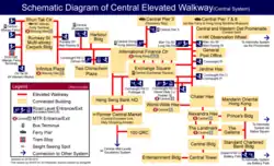 Waren es zunächst meist reine Überwege, wurden seit den 1970er-Jahren verstärkt komplexe Brückensysteme entwickelt, die bedeutende Gebäude miteinander verbinden. Herausragend ist dabei der Central Elevated Walkway (中區行人天橋系統) zwischen Bürogebäuden und Einkaufszentren in Central.[4] 1972 wurde das Hochhaus Jardine House (unter dem Namen Connaught Centre) fertiggestellt und mittels Brücken mit Gebäuden der Umgebung verbunden.[3] Später folgten Alexandra House und das General Post Office. Heute erstreckt sich das Brückensystem unter anderem über Two IFC bis zum Hong Kong Macau Ferry Terminal und schließt auch die MTR-Stationen Central, Hong Kong und Sheung Wan sowie die Schiffsanlegestellen der Central Ferry Piers ein. Der Brückenkomplex in Central ist verbunden mit einem ähnlichen System in Admiralty. Damit ist es möglich, eine Strecke von mehr als zwei Kilometern auf Fußgängerbrücken zurückzulegen.[4] Der bekannte Central Mid-Levels Escalator ist ebenfalls über das Brückennetz erreichbar.