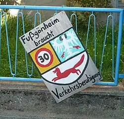 Blasonierung: „Geteilt und oben gespalten, oben rechts in Gold ein sechsspeichiges rotes Rad, oben links in Blau ein rotbewehrter silberner Adler, unten in Silber ein springender roter Fuchs.“[12] |