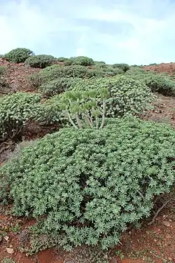 Angesichts geringer Niederschläge ähneln weite Teile der Insel einer Halbwüste, in der vornehmlich gegen Trockenheit resistente Arten (Xerophyten) vorkommen. Durch die isolierte geographische Lage begünstigt konnten sich etliche endemische Arten ausbilden. Eine Charakterpflanze Fuerteventuras ist der Strauch-Dornlattich (Launaea arborescens), ein auch in Nordwestafrika und der Sahara weit verbreiteter genügsamer Strauch, der perfekt an trockenes Klima angepasst ist und monatelang ohne Wasser auskommt. Auf den Kanaren ist er als aulaga bekannt. Vielerorts sind Wolfsmilchgewächse wie König-Juba-Wolfsmilch (Euphorbia regis-jubae) und Balsam-Wolfsmilch (Euphorbia balsamifera) zu sehen, letztere wird auf Fuerteventura tabaiba dulce (deutsch Süße Wolfsmilch) genannt. Einem Kaktus ähnlich ist die Kanaren-Wolfsmilch (Euphorbia canariensis), deren kandelaberartige Triebe eine Wuchshöhe von bis zu 3 m erreichen. Auf Fuerteventura ist diese Art u. a. im Barranco de Vinamar anzutreffen.[11] Ebenfalls oft mit einem Kaktus verwechselt wird die Jandía-Wolfsmilch (Euphorbia handiensis). Die endemische Art kommt bis auf vereinzelte Exemplare im Inselnorden ausschließlich auf der Halbinsel Jandía vor.[11]