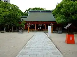 • Der 923 gegründete Hakozaki-Schrein (Hakozaki-gū) dient der Verehrung des Kriegsgottes Hachiman. Er befindet sich in der Nähe der medizinischen Fakultät der Kyūshū-Universität im östlichen Stadtviertel Hakozaki (einst ein vor der Stadt gelegenes Dorf).