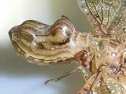 Die Funktion des auffallenden Kopffortsatzes könnte als eine Form der Mimikry in der Feindvermeidung liegen. In der Seitenansicht ähnelt das Tier dadurch baumlebenden Eidechsen, zum Beispiel Plica plica, mit denen sie zusammen vorkommt. Möglicherweise werden sie deshalb von den Eidechsen für Artgenossen gehalten und deshalb bei der Jagd ignoriert.[3] Gleichsam der Feindvermeidung dienen die Augenflecken auf den Hinterflügeln. Das Insekt ist bei Ansicht von oben recht gut getarnt und ähnelt den Flechtenüberzügen auf Baumstämmen. Entdeckt es dennoch ein Vogel, werden die Augenflecken plötzlich präsentiert, um den Angreifer zu erschrecken.