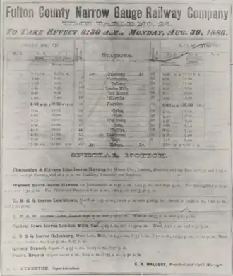- ↑ Timetable of Fulton County Narrow Gauge Railway Company, 1886.