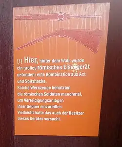 Im Jahre 1992 kam das bronzene Mundblech einer Schwertscheide aus dem Boden. Die Untersuchungsergebnisse wurden der Öffentlichkeit im Jahre 2007 vorgestellt. Das Mundblech trägt eine Besitzer-Ritzinschrift mit der Abkürzung LPA. Die Inschrift kann als L(egio) P(rima) A(ugusta) gelesen werden.[18]