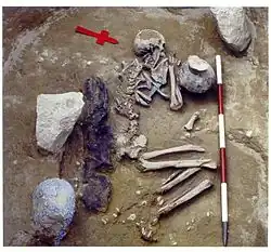 Nur ein Grab (Abb. 2) erwies sich nach der Aufdeckung als ungestört: das Grab eines jungen Mannes, der durch eine Schädelverletzung starb. Er war noch im Tod mit einem Dolch bewaffnet. Das beigegebene Keramikgefäß, das mit einer Steinplatte abgedeckt vorgefunden wurde, beinhaltete ein Getränk. Eines der jüngsten Gräber ist das eines Häuptlings, das durch die Gewandnadel – eine tordierte schräggelochte Kugelkopfnadel – an das Ende der Frühbronzezeit 1600 v. Chr. datiert werden kann. Er trug einen Bronzedolch und eine geschliffene Steinaxt. Diese Waffe ist für die ausgehende Steinzeit (bis 2300 v. Chr.) kennzeichnend. Möglicherweise zeichnete sie den Besitzer als einen Würdenträger einer jahrhundertelangen Tradition aus. Die zum Gräberfeld gehörende Siedlung war wahrscheinlich in der Nähe. Die Gegend war in der Frühbronzezeit dicht besiedelt, wie mehrere zeitgleiche Fundstellen in der näheren Umgebung nachweisen.