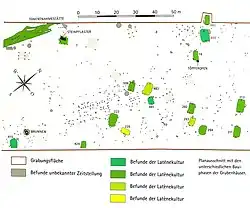 Im Süden (Abb. 3) des dokumentierten Grabungsbereichs kamen die Rest einer keltischen Siedlung zu Tage: ein Brunnen, zahlreiche Grubenhäuser und ein Töpferofen sprechen von der Anwesenheit einer bäuerlichen Bevölkerung, die dem Stamm der Boier zuzurechnen ist. Von den eigentlichen Wohnhäusern, die aus Holz, Lehm und Stroh gebaut waren, blieben keine Spuren im Boden erhalten. Die vorgefundenen Grubenhäuser dienten als Werkstätten beispielsweise zum Schmieden, Töpfern und Weben. Sie zeichneten sich durch schmal-rechteckige humose Verfärbungen im umgebenden lehmigen Boden ab. Charakteristisch für diese Häuser ist der auf jeweils einer Schmalseite befindliche Firstpfosten, der im Boden eingetieft war, was durch die erhaltenen Pfostengruben noch sichtbar war. In den Häusern wurden Werkzeuge aus Eisen, Alltagsgegenstände aus Ton und Schmuckstücke aus Glas gefunden. Teile eines sehr gut erhaltenen Töpferofens erlauben Einblicke in das Handwerk der Töpferei. Wie vorgefundene Keramikfragmente belegen, wurden Gefäße mit Hilfe der Töpferscheibe hergestellt.