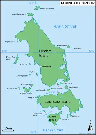 Die New-Year-Island-Gruppe mit der Hauptinsel King Island am Westende der Bass-Straße sowie die nordwestlich der Furneaux-Gruppe in Richtung Australien gelegene Kent-Gruppe werden nicht der Inselgruppe zugerechnet.