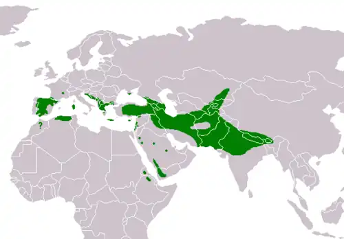 Über die Verbreitung in Asien gibt es in der Literatur zum Teil widersprüchliche Angaben. Nach Ferguson-Lees & Christie[6] erstreckt sich das Areal über den Nahen und Mittleren Osten und dann unter Aussparung der zentralasiatischen Hochgebirge nach Nordosten bis in den Südosten Kasachstans und nach Südosten über den Iran und Afghanistan über Pakistan und den Norden Indiens bis in das Flachland Nepals, möglicherweise auch noch bis Bhutan. Als unsicher und wahrscheinlich nur herumstreifende Gäste betreffend bezeichnen die Autoren das Vorkommen in Assam. Nach Glutz von Blotzheim und Bauer[7] reicht das Areal der Art im Nordosten bis in den Nordwesten der Mongolei und im Südosten nur bis in den Südwesten Pakistans und in das nordindische Unionsterritorium Jammu und Kashmir.