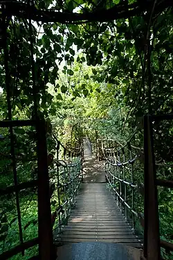 - Auf dem höchsten Punkt der Wald- und Sonnengärten führt ein Panorama-Steg aus Metallgittern durch eine Papageien-Voliere.