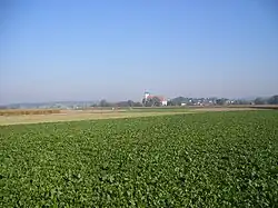 Gäubodenlandschaft, im Hintergrund Kloster Oberalteich