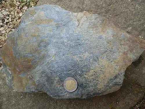 Zirka 500 Meter nördlich vom Moulin du Pont fand sich im Hangenden der Formation eine kristalline Kalklinse, die neben runden Seelilienstengeln eine reichhaltige Conodontenfauna beherbergte. Trotz des schlechten Erhaltungszustandes der zerbrochenen Fossilien konnten folgende Taxa identifiziert werden: Spathognathodus sp., Spathognathodus streinhornensis, Ligonodina sp., Neoprioniodus sp., Trichonodella sp. und das obersilurische Leitfossil Ozarkodina sp..