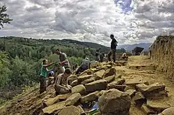 Der Schwerpunkt der Grabungskampagne lag 2015 auf der Untersuchung der Terrasse, wo man auf etwas völlig Unerwartetes stieß. Nach dem Entfernen der Rückstände der Stützmauer auf der Gefälleseite fand man die Außenfläche einer massiven Wand aus eng liegenden Sandsteinblöcken von 70 cm bis 100 cm Länge. Statt der unregelmäßigen Blöcke, die die Innenfläche bildeten, enthielt die Außenfläche der Mauer viele aus groben Sechsecken gebildete, noch fest verbundene und in situ erhaltene Mauerverbände mit einer Höhe von bis zu 1,0 m. Unter Berücksichtigung der Terrassenhöhe und der Anzahl der Sandsteinblöcke, die von der Wand gefallen waren, ist es logisch anzunehmen, dass die ursprüngliche Mauer etwa 3,0 m Höhe erreichte. Darüber hinaus wurden die Überreste eines Tores entdeckt, bestehend aus einem 1,3 m breiten Durchgang. Die Monumentalität der zwischen 1750 und 1690 v. Chr. datierten Steinarchitektur macht die Befestigung zum ältesten Beispiel einer Steinmauer in Polen.