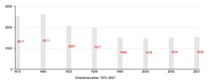 | 1871 | 2438 | am 1. Dezember, in 264 Häusern, davon 2408 Evangelische, 14 Katholiken, vier sonstige Christen und zwölf Juden[14] |