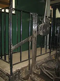 - ↑ In der Mitte dieser Zeichnung der ebenfalls mit einem Seil bedienten Heberleinbremse ist eine solche Umlenkrolle q über der Seilwinde zu sehen.