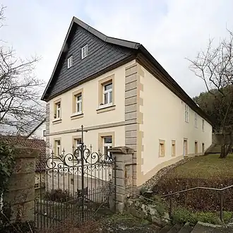 - Haus Nr. 25: Gasthaus Alex. Zweigeschossiges Wohnstallhaus mit Satteldach, der Wohnteil ist im Erdgeschoss aus verputzten Sandsteinquadern mit Eckrustizierung, das Obergeschoss und der Giebel bestehen aus verschiefertem Fachwerk; der Stallteil mit hakenförmig angebautem Walmdachtrakt ist in beiden Geschossen verputzt massiv und hat ein Gurt- und Kranzgesims; der Wohnungstürsturz ist mit „Johann Schultheiß 1843“, die Stalltür mit „1842“ bezeichnet, darüber befinden sich eine waagrechte Gesimsverdachung und Stabkonsolen.[11]