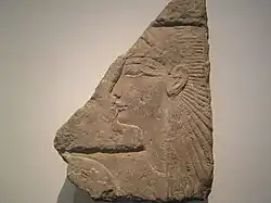 „Auf dem unregelmäßig herausgebrochenen Reliefblock ist im Profil nach links gewandt der Kopf einer Frau erhalten, die eine Geierhaube trägt. Diese besteht aus dem Balg eines (weiblichen) Geiers, der über die Perücke gestülpt getragen wurde. Die waagerechte Verlängerung ihrer Schulterlinie zeigt an, dass die Frau ihren rechten Arm erhoben ausgestreckt hielt, um eine Person zu umarmen. Nach vergleichbaren Szenen kann dies nur ein König gewesen sein. Am linken Bildrand ist noch seine Schulter erhalten. Wahrscheinlich handelt es sich bei der Frau um eine Göttin, wenn es auch aufgrund der Geierhaube theoretisch eine Königin sein könnte. Ihre Gesichtszüge sind fein und gleichzeitig markant ausgearbeitet: die Augenbraue ist lang und leicht geschwungen, das Auge groß und von betonten, lang ausgezogenen Schminkstrichen umgeben; die nur ganz leicht gebogene Nase, der kleine Mund und das vorspringende Kinn verleihen dem Profil Klarheit und dem Gesicht einen energischen Ausdruck. Am Hals ist noch der obere Rand eines breiten Halskragens erkennbar.“