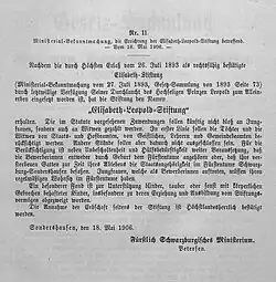 - ↑ Vermutlich angeregt durch die Stiftung der Gräfin Johanne Elisabeth von Schwarzburg vom Gleichen’schen Hause in Arnstadt (Gesetz-Sammlung 1862 Nr. 35).