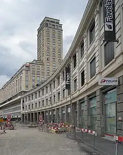 - ↑ Vor dem Gebäude die Baustelle der neuen Strassenbahn, dahinter der Bel-Air-Turm.