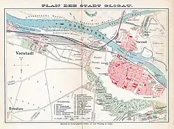 Um 1900 hatte Glogau drei evangelische und drei katholische Kirchen (darunter der gotische Dom auf einer Oderinsel), eine Synagoge, ein königliches Schloss, ein staatliches katholisches und ein evangelisches Gymnasium, eine Reihe unterschiedlicher Fabrikationsbetriebe und war Sitz eines Landgerichts.[7]