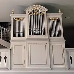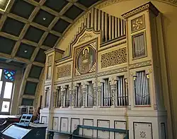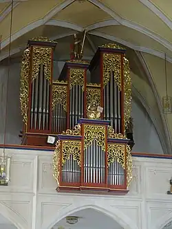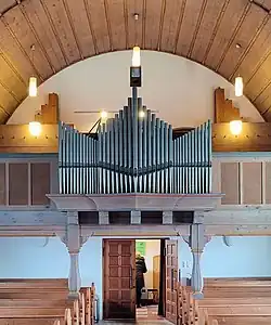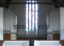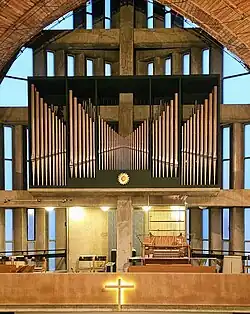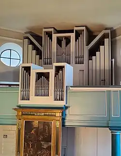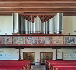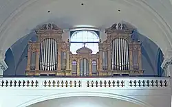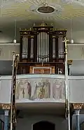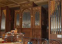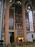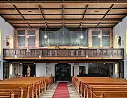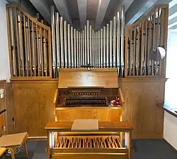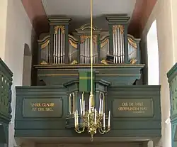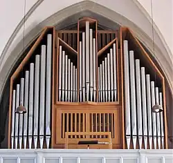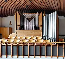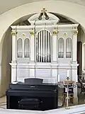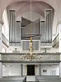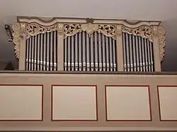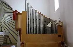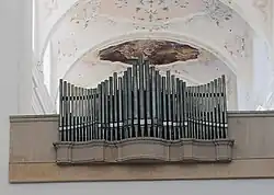 I/P | 5 | Der Prospekt an der Brüstung besteht aus Blindpfeifen. Das Werk befindet sich in einem eigenen Gehäuse hinter dem Spieltisch. → Orgel | ||||||||