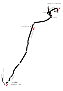 Das Rennen begann ursprünglich in der Waldstraße. Um die Strecke auf vier Kilometer zu verlängern, wurde der Start später an den heutigen Lessingpark gegenüber dem Bahnhof Ilmenau-Bad verlegt. Nach einer Linkskurve lag vor den Fahrern der steilste Abschnitt der Strecke, Ilmenaus Waldstraße. Am Ritzebühler Teich verließ die Strecke Ilmenau und führte weiter durch das Gabelbachtal. Anfänglich auf fast gerader Strecke blieben links der Tennisplatz und die Eisstockanlage liegen, um etwa nach halber Länge an der Rennfahrerkurve in eine „Schikane“ überzuleiten. An diese Stelle setzten Ilmenauer Motorsportfreunde einen Erinnerungsstein zu Ehren des beim Buckower Dreieckrennens verunglückten Thüringer Rennfahrers Huldreich Heusser, der viermal nacheinander das Gabelbachrennen gewonnen hatte.