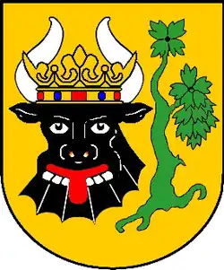| Blasonierung: „In Gold rechts ein hersehender, golden gekrönter schwarzer Stierkopf mit aufgerissenem roten Maul, silbernen Zähnen, ausgeschlagener roter Zunge, in sieben Spitzen abgerissenem Halsfell und silbernen Hörnern, links ein ausgerissener grüner Busch mit dreizackigen Blättern.“[19] | |