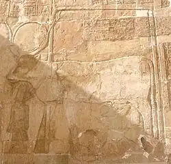 - ↑ Das Kestner-Museum in Hannover besitzt auch für Mentuhotep II. eine fragmentarische Darstellung, die den König an den Zitzen der Hathor-Kuh göttliche Milch saugend zeigt. Inv.-Nr. 1935.200.82. Abb. und Beschreibung bei Rosemarie Drenkhahn (Hrsg.): Ägyptische Reliefs im Kestner-Museum Hannover (Sammlungskatalog 5), Hannover: Kestner-Museum 2. Aufl. 1994, 62 f.