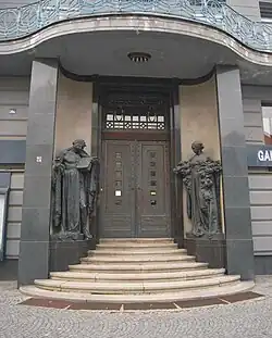 Sein Haupteingang erhielt, ebenso wie das Foyer, eine repräsentative Ausstattung. Dazu gehören zwei Bronzeplastiken von Ladislav Šaloun im Außenbereich des Haupteingangs. Die linke Plastik (Obchod / Gewerbe) zeigt einen Mann in lesender Haltung mit einem großen Buch in der linken Hand. Auf der rechten Seite steht eine Frauenfigur (Úroda / Ernte), die in ihren beiden Händen eine Fülle von Gartenfrüchten hält. Die zweiflügelige Eingangstür ist ein Bronzearbeit mit verschiedenen rahmenartigen Verzierungen in Form von Treibearbeiten und jeweils einer senkrecht angeordneten Reihe kleiner quadratischer Fenster. Über ihr ist ein Oberlichtfenster mit facettierten Glasscheiben und ornamentaler Gestaltung eingesetzt.