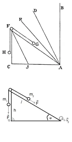 - ↑ J. L. Lagrange bemerkt in seinem historischen Einleitungskapitel der Mécanique Analytique (Première partie: la statique, Section première: § 6, S. 8, in der 3. Auflage von 1853) dazu (ins Deutsche übersetzt): «In den Mécaniques von Galilei, erstmals im Französischen durch Pater Mersenne im Jahr 1634 veröffentlicht, wird das Gleichgewicht auf einer schiefen Ebene auf das eines Hebels mit zwei gleichen Hebelarmen zurückgeführt […], indem das einem angewinkelten Hebelarm anbrachte Gewicht so betrachtet wird, als wäre es an einem entsprechend horizontalen angehängt […] Man kann sagen, dass hier wohl der erste direkte Beweis vorliegt, der vom Gleichgewicht auf einer schiefen Ebene erhältlich sein dürfte». Außerdem heißt es in § 16, S. 18: «Galilei hat dann [das Prinzip der virtuellen Arbeit] an der schiefen Ebene wiedererkannt wie auch an den Maschinen, die davon abhängig sind, und er hat es als eine allgemeine Eigenart des Gleichgewichts von Maschinen bemerkt.»