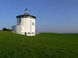 Frühe christliche Kirchen hatten oft die Form eines Rundbaus. Mönche aus Irland missionierten zwischen dem sechsten und achten Jahrhundert das Allgäu. Der sakrale Rundbau mit zehn Meter Durchmesser soll ein Begegnungsort zwischen Reisenden, Einheimischen, Christen verschiedener Konfessionen, Jung und Alt sein. Ein sternförmiges Holzdach wird von acht Säulen über einem verputzten Mauerring getragen. Über ein darunter umlaufendes Fensterband erfolgt auch die Belichtung des Raumes. Eine mittige Glaslaterne mit Kreuz und Kugel ersetzen den Kirchturm.
