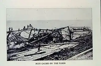 Im Jahre 1900 lag die höchste natürliche Erhebung der Insel nur 2,6 Meter über dem Meeresspiegel. Die Flutwelle, die die Orkanwinde aus dem Golf vor sich hertrieben, war 4,6 Meter hoch und spülte über die gesamte Insel hinweg. Die Gebäude, die der Wind nicht zerstört hatte, wurden von den Wellen von ihren Fundamenten und Pfeilern gehoben und zertrümmert. Über 3600 Häuser der Stadt wurden zerstört. Am Morgen des 10. September säumte eine lange, hohe Mauer von Trümmern die Küste des Ozeans.