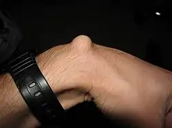 Ein Ganglion (griechisch γάγγλιον „Geschwulst“, „knotenartig“, umgangssprachlich wie andere ähnlich aussehende Phänomene ungenau auch „Überbein“) ist eine einzeln oder mehrfach auftretende, gutartige Geschwulstbildung im Bereich einer Gelenkkapsel oder oberflächlichen Sehnenscheide (Sehnenscheidenhygrom).[1] Die Bezeichnung „Überbein“ ist insofern irreführend, als die Verwendung des Begriffs „Bein“ die Betroffenheit eines Knochens suggeriert (vgl. Nasenbein, Fersenbein, Schienbein). Ein wirkliches Überbein wird Exostose genannt.