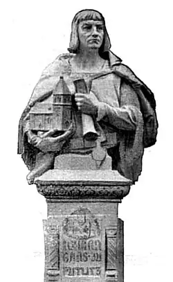 Büste in der Siegesallee, Berlin, Denkmalgruppe 3. Dargestellt mit Modell der Klosterkirche Marienfließ und Stiftungsurkunde.
