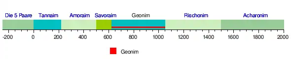 Die Epoche der Geonim begann 589 (nach dem jüdischen Kalender: 4349), nach der Periode der Sevora'im, und endete 1038 (nach dem jüdischen Kalender: 4798). Der erste Gaon von Sura war, wenn man Sherira Gaon folgt, Mar Rab Mar, dessen Amtszeit 609 begann. Der letzte Gaon von Sura war Samuel ben Ḥofni, der 1013 starb; der letzte Gaon von Pumbedita war Hezekiah Gaon, der 1040 ermordet wurde; somit hatte die Periode der Geonim fast eine Dauer von 450 Jahren.