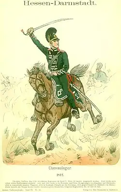 - Im Revolutionskrieg gegen Frankreich kämpfte das Regiment auf Seiten der Koalition (Preußen/Österreich) bis 1796 in der Pfalz und den Niederlanden. Nachdem Hessen-Darmstadt von Napoléon I. in den Rheinbund gezwungen worden war, fochten die Chevaulegers 1806/07 gegen Preußen, 1809 gegen Österreich und 1812 gegen Russland. 1813 kämpfte das Regiment noch auf französischer Seite bei Großgörschen, Bautzen und gegen die Allianz der Gegner Napoleons. In der Völkerschlacht bei Leipzig stand es mit der 92 Reiter starken 1. Escadron in der französischen 29. Leichten Kavalleriebrigade der 38. Infanteriedivision im 4. Corps von Général Bertrand.