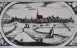 - Martin Zeiller: Gartz. In: Matthäus Merian (Hrsg.): Topographia Electoratus Brandenburgici et Ducatus Pomeraniae (= Topographia Germaniae. Band 13). 1. Auflage. Matthaeus Merians Erben, Frankfurt am Main 1652, S. 58–59 (Volltext [Wikisource]).