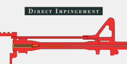Bei einigen Gasdruckladern wurde eine andere technische Variante umgesetzt, bei welcher die Gase durch ein Gasrohr in das Waffeninnere geleitet werden und dort unmittelbar auf den Verschlussträger wirken (engl. direct impingement). Die erste Serienwaffe mit einem solchen kolbenlosen Gassystem war das schwedische Gewehr Ag m/42, es kam später auch beim französischen Gewehr MAS-49 zum Einsatz. Der Wegfall von Gaskolben und Gasgestänge ermöglicht bei diesem Prinzip eine merkliche Gewichtsersparnis, jedoch gelangen heiße Gase und Pulverrückstände direkt in die Waffe, was die Gefahr von Funktionsstörungen durch Ablagerungen birgt. Eine modifizierte Variante dieses Systems, erfunden von Eugene Stoner, kommt in den Gewehren AR-10 und AR-15 sowie deren Derivaten, z. B. dem M16, zur Anwendung. Dabei werden die Gase in eine abgedichtete Expansionskammer zwischen Verschlusskopf und Verschlussträger geleitet. Der Verschlusskopf fungiert als stationärer Kolben und der Verschlussträger als beweglicher Zylinder. Durch die abgedichtete Expansionskammer wird die Verschmutzung eingegrenzt.[8] Trotzdem erlangte das M16 erst nach umfangreichen Entwicklungsarbeiten eine ausreichende Zuverlässigkeit, jedoch ohne die Funktionssicherheit von Gaskolbenladern zu erreichen (siehe dazu: Technische Mängel des M16).