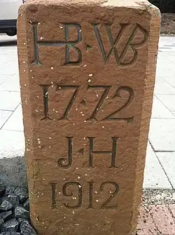 Ein während des Baus des Hoteltraktes aufgefundener Markstein weist Kürzel und Jahreszahlen aus, die bislang noch nicht sicher gedeutet sind.