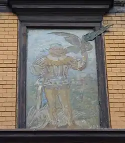 Im zweiten Obergeschoss wurde ein Blindfenster als Bildfläche genutzt. Dargestellt ist ein Falkner vor der Esslinger Burg, der sein Tier auf der linken Hand hält. Ein Flügel des Falken ist plastisch gearbeitet.