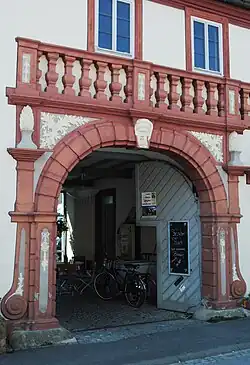 Die Portalanlage des zweigeschossigen Gebäudes aus heimischem Sandstein besteht aus einem rundbogigen Hoftor und dem Eingangsportal, das mit den Initialen des Bauherrn H B U, für Hans Barthel Ulrich, und der Jahreszahl 1708 versehen ist. Das Portal wird von einer Figurengruppe der Heiligen Familie bekrönt, über der Gottvater und der Heilige Geist schweben.