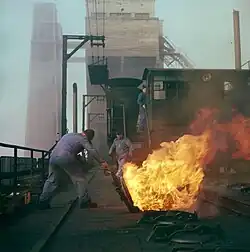 Gaswerk Zürich, Kammerofendecke mit Füllwagen. Arbeiter beim Abdecken eines Fülllochs. Im Hintergrund Kohlensilo mit aufgebautem Wasserreservoir, links die Löschturme der Koksaufbereitung.