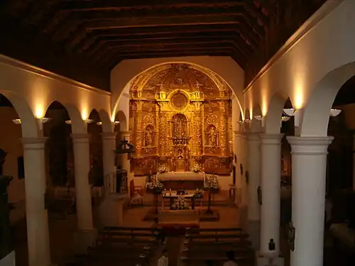 - Die Iglesia de San Pedro (früher Iglesia de la Virgen de las Nieves) entstammt dem 15. Jahrhundert und ist in alter Mudéjartradition nahezu vollständig aus Ziegelsteinen erbaut; lediglich der Glockenturm mit Spitzhelm ist aus Haustein errichtet. Das dreischiffige Innere des Bauwerks ist mit im 19. Jahrhundert erneuerten offenen Dachstühlen gedeckt. Der durch geschnitzte Säulen gegliederte und mit Figuren besetzte spätbarocke Hauptaltar ist ein kleines Meisterwerk seiner Art.[7]
